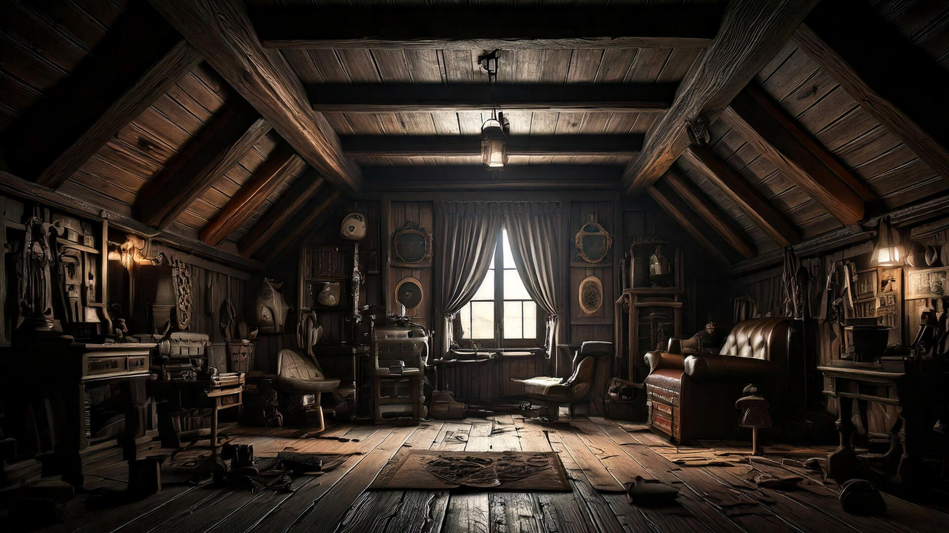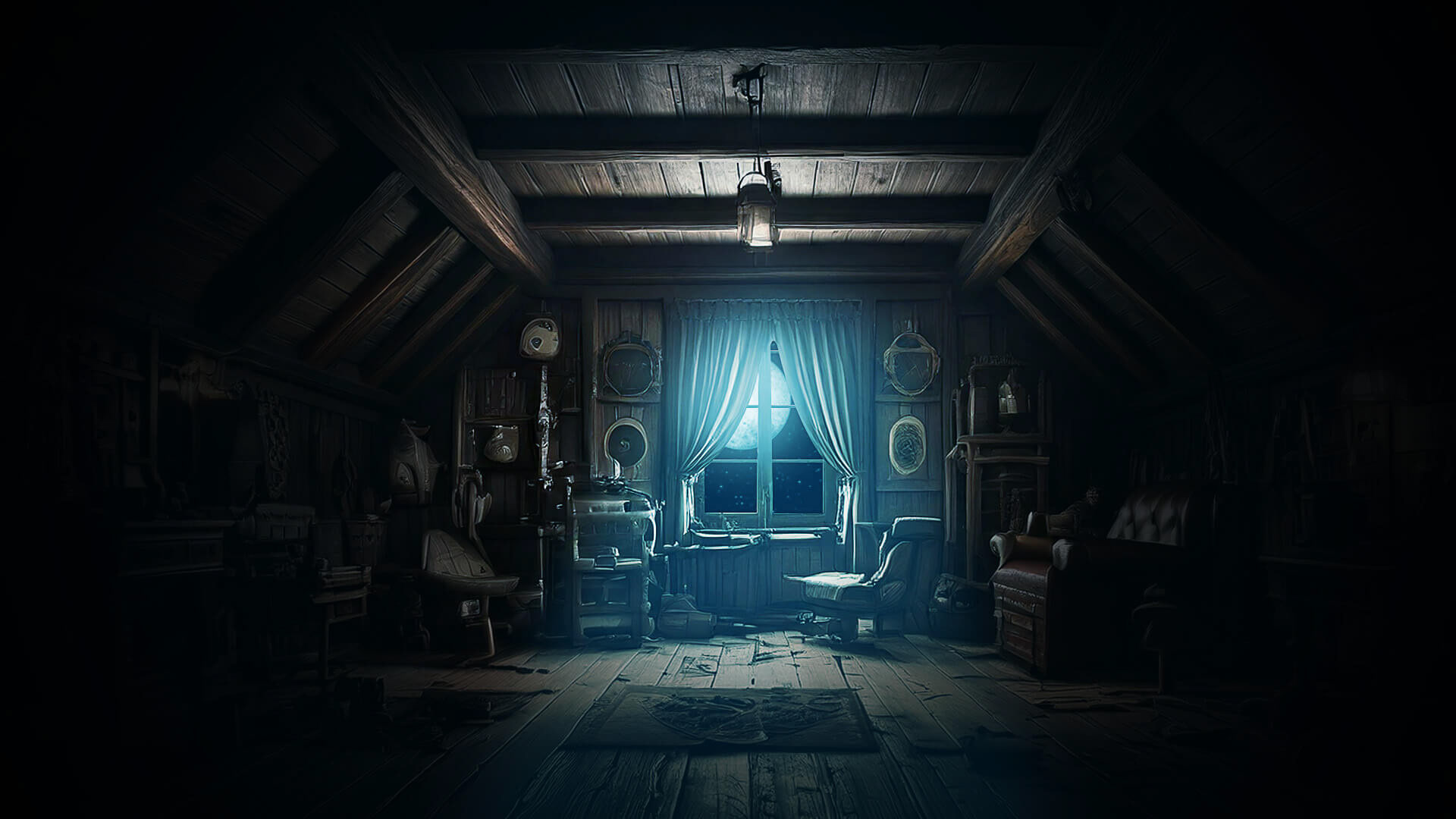 Here's an attic from "Mystery Team - The Ghost of Willowmoore". I isolated the window and made it transparent so the pretty moon could be seen.